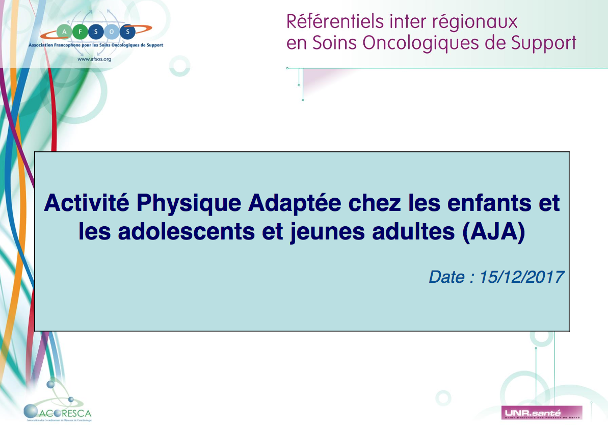 Après 3 productions dédiées à l’adulte, c’est en ce début d’année 2018 que le référentiel « Activité Physique Adaptée chez les enfants et les adolescents et jeunes adultes (AJA) » de l’Association Francophone des Soins Oncologiques de Support (AFSOS) vient de paraitre.