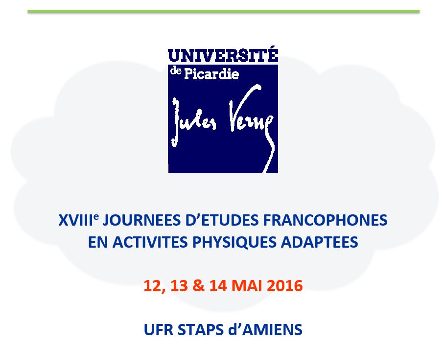 L'AFAPA organise la 18ème journée d'études francophones en activités physiques adaptées sur Amiens du 12 au 14 mai 2016. La SFP-APA aura une session spécifique le samedi 14 mai au matin pour débattre autour du référentiel d'activités et de compétences de l'enseignant en APA. C'est aussi l'occasion pour la SFP-APA d'organiser son Assemblée Générale Élective lors de cette même matinée.