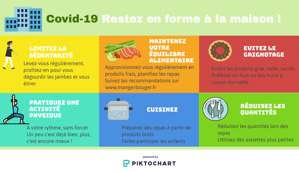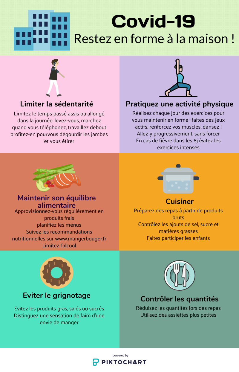 •  Pour en savoir plus sur les recommandations associées à l’activité physique et à l’alimentation : Chantal J., Hercberg S., Vuillemin A., Foucaut A-M., Oppert J-M., Lombrail P. Alimentation, activité physique, les bons réflexes en période de confinement. Mars 2020.