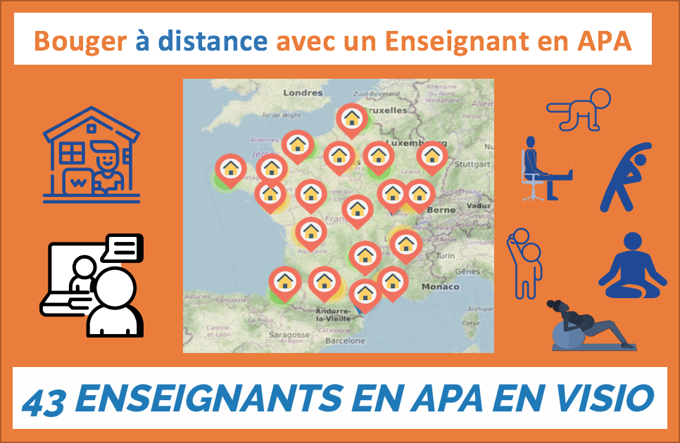 En cette période de confinement qui restreint les possibilités de pratiques d’activité physique et de déplacements, les séances en visio se sont fortement développées. Pour vous permettre d’identifier les enseignants en activité physique adaptée qui proposent des séances et des accompagnements à distance (en visio) durant le confinement, nous avons fait apparaitre la mention « visio » sur la fiche du professionnel. Aussi, il vous est possible de trouver facilement un enseignant en activité physique adaptée proposant ce service dans la liste disponible sur le site.