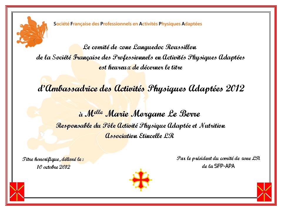 Le comité de zone Languedoc Roussillon de la SFP-APA est heureux de vous informer que le titre d'Ambassadrice des activités physiques adaptées 2012 a été décerné à Melle Marie Morgane Le Berre, lors du congrès 'quel regard face au cancer' qui s'est tenu le 10 octobre 2012, au centre Rabelais de Montpellier, à l'occasion de l'étape du Ruban de l'espoir dans l'Hérault.