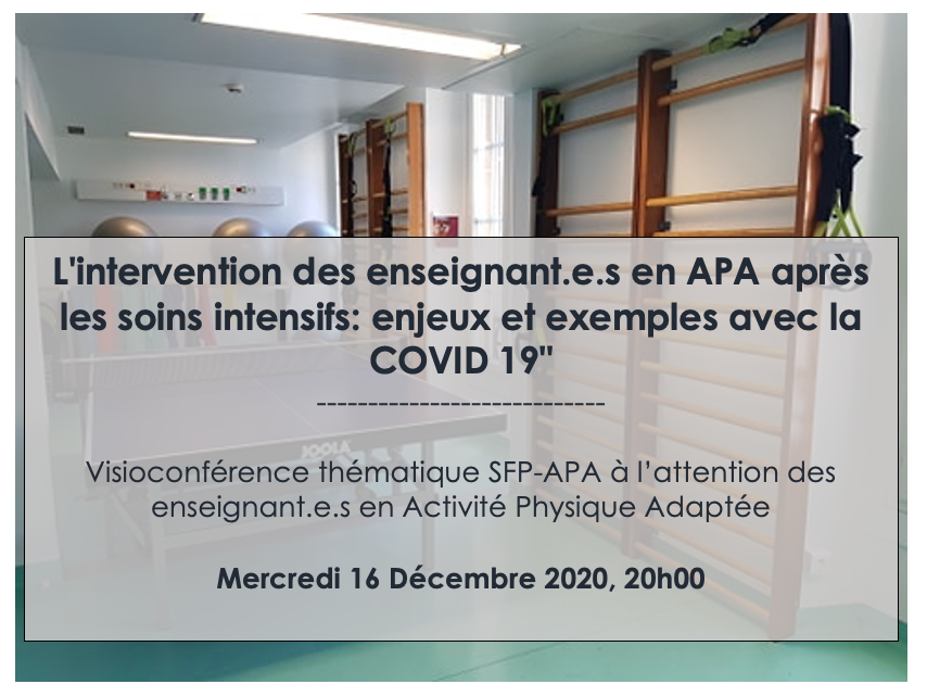 Mercredi 16 Décembre 2020 à 20h00 le service Podcast de la SFP-APA vous propose une visioconférence thématique à l'attention des Enseignant.e.s en APA ayant pour thème : "L'intervention des Enseignant.e.s en APA après les soins intensifs: enjeux et exemples avec la COVID 19"