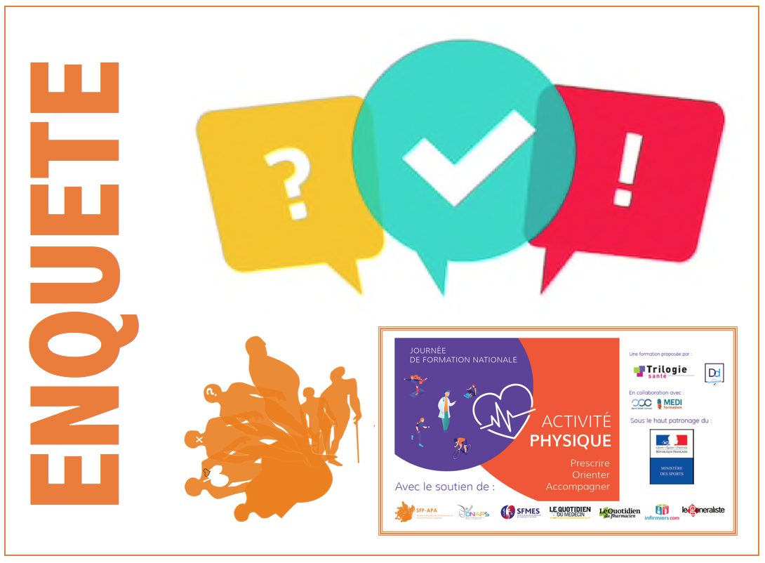 Pour présenter l'exercice d'EAPA aux professionnels du sport, de la santé et des collectivités territoriales, la SFP-APA vous propose de participer à cette enquête nationale : soyez nombreux à participer à cette enquête afin de mettre en lumière l'EAPA !! Durée : 2 minutes.