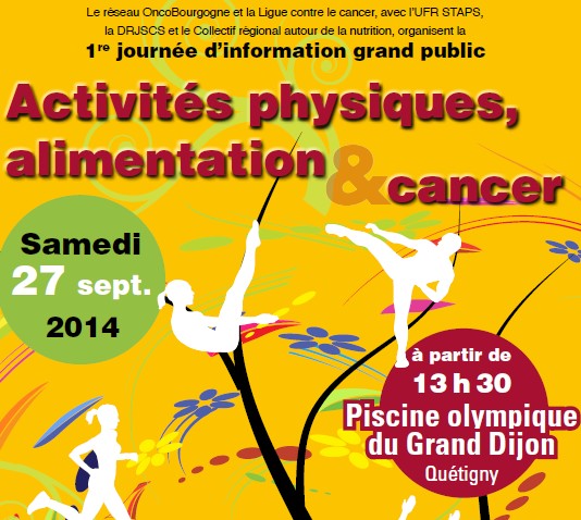 Le réseau régional de cancérologie de Bourgogne et le comité départemental de Côte d'Or de la ligue contre le cancer organisent, en partenariat avec l'UFR STAPS*, la DRJSCS** et le CRAN***, la 1ère journée d'information grand public « Activités physiques, alimentation et cancer ».