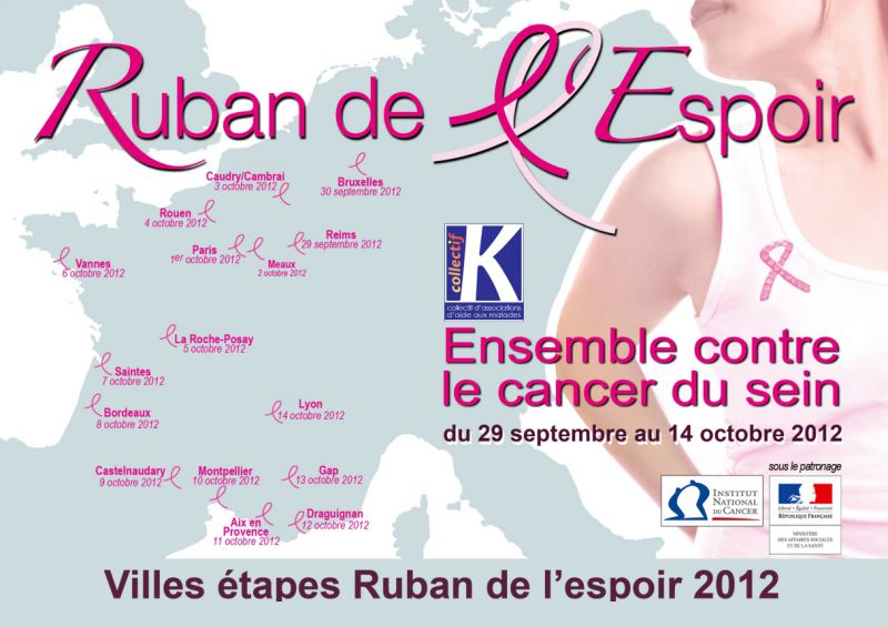 Le ruban de l’espoir a débuté son tour de France. La délégation porteuse de la flamme fera étape dans les villes suivantes : (source http://www.rubandelespoir.fr/villesetapes2012.html).